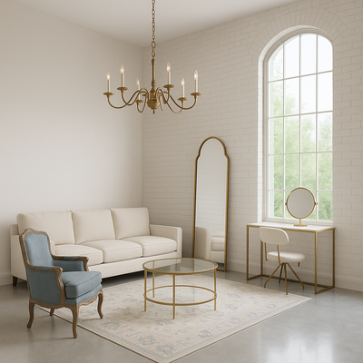 Tucked within the mill’s original architecture, Soft natural light floods the room through a tall arched window, illuminating a mix of modern textures and timeless details — from the sage green sofa to the glossy concrete floor. It’s more than a place to get ready — it’s where you’ll share laughter, toasts, and quiet moments before walking down the aisle.