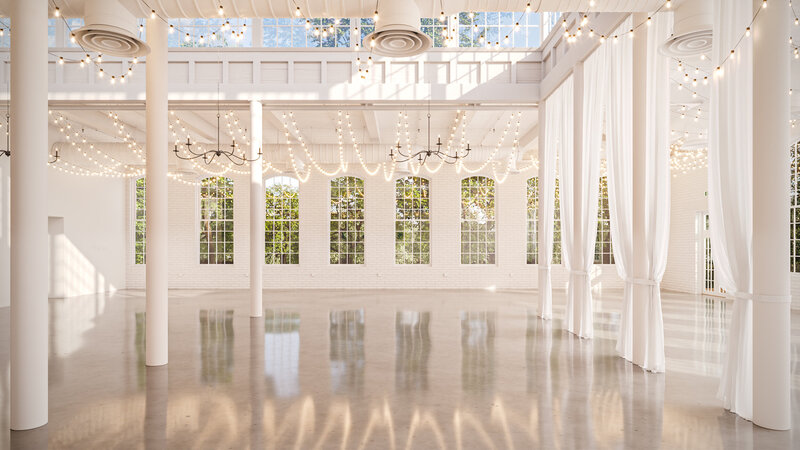 The Foundry Room is the heart of Savelle — a light-filled canvas framed by the mill’s original architecture and refined with modern finishes. Its open layout allows for seamless ceremony-to-reception transitions, while the surrounding windows bathe the room in natural light from every angle.